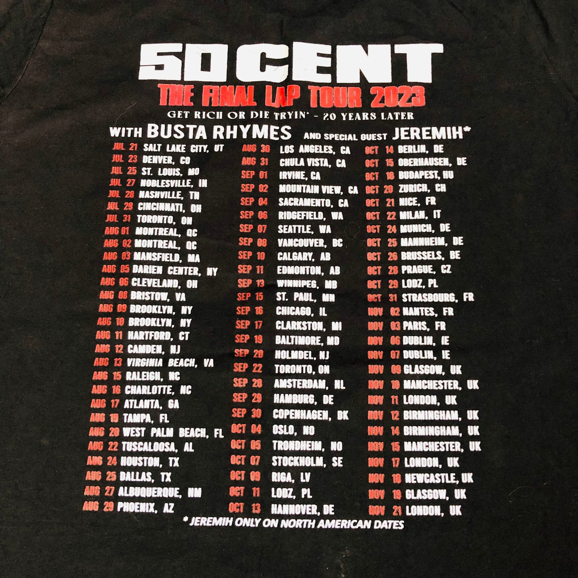 Rep the legend in style with this official 50 Cent Final Lap Tour 2023 T-shirt, celebrating 20 years since Get Rich or Die Tryin’. Featuring bold tour graphics front and back, including all dates and cities, this black Fruit of the Loom tee (Ladies Valueweight, size L) is made from 100% cotton for all-day comfort. A must-have for fans of hip-hop and music memorabilia – great for festivals, casual streetwear, or collectors!