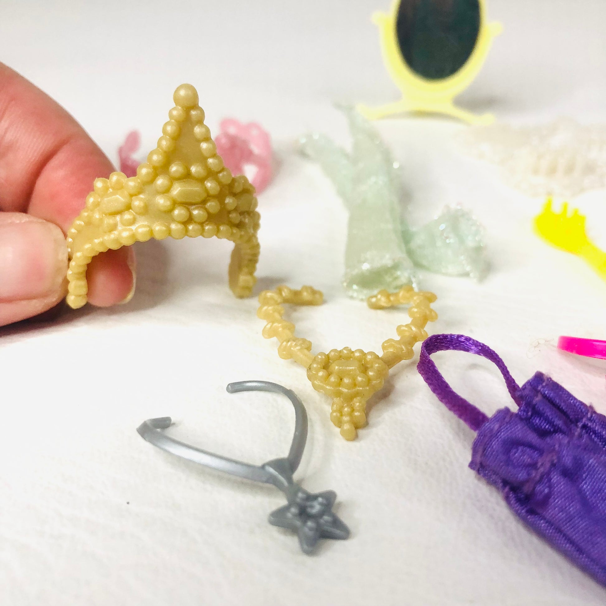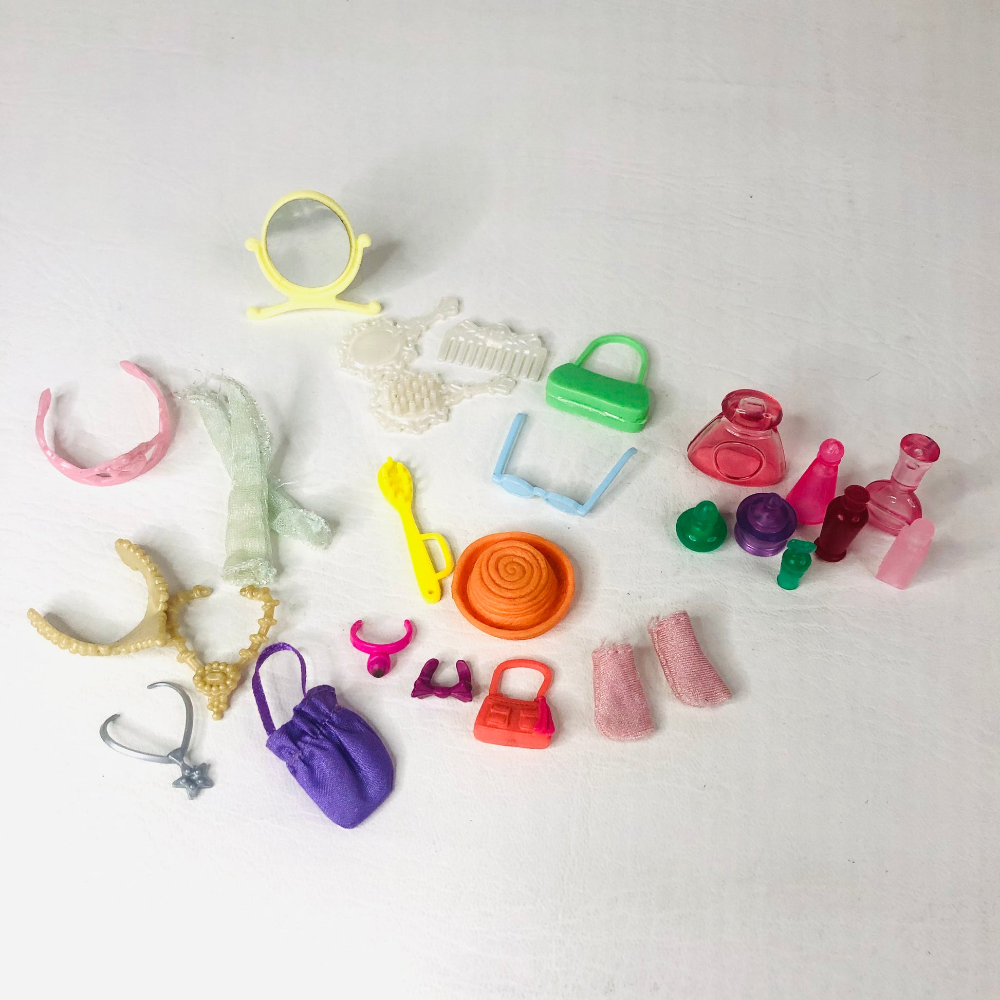 Step into Barbie’s glamorous world with this vintage-inspired bundle of 25+ beauty and fashion accessories! Includes a mix of mini perfume bottles, mirror & brush set, handbags, tiara, jewellery, sunglasses, and more – perfect for completing Barbie’s dressing table or adding charm to dollhouse play. A fabulous mix of retro Barbie accessories, ideal for collectors or imaginative play. 🌸✨