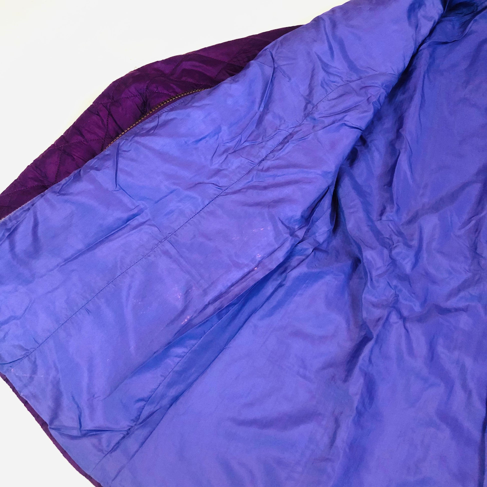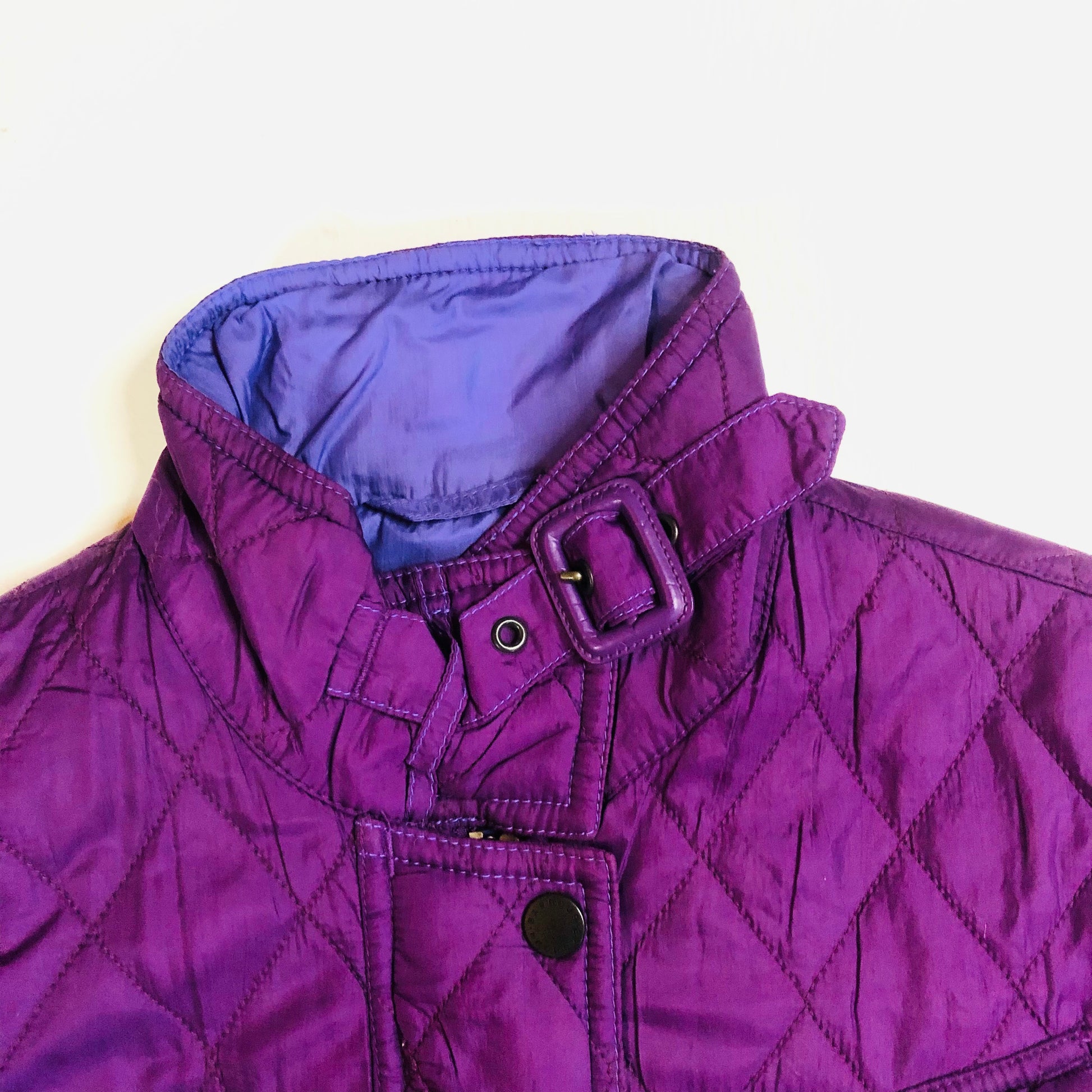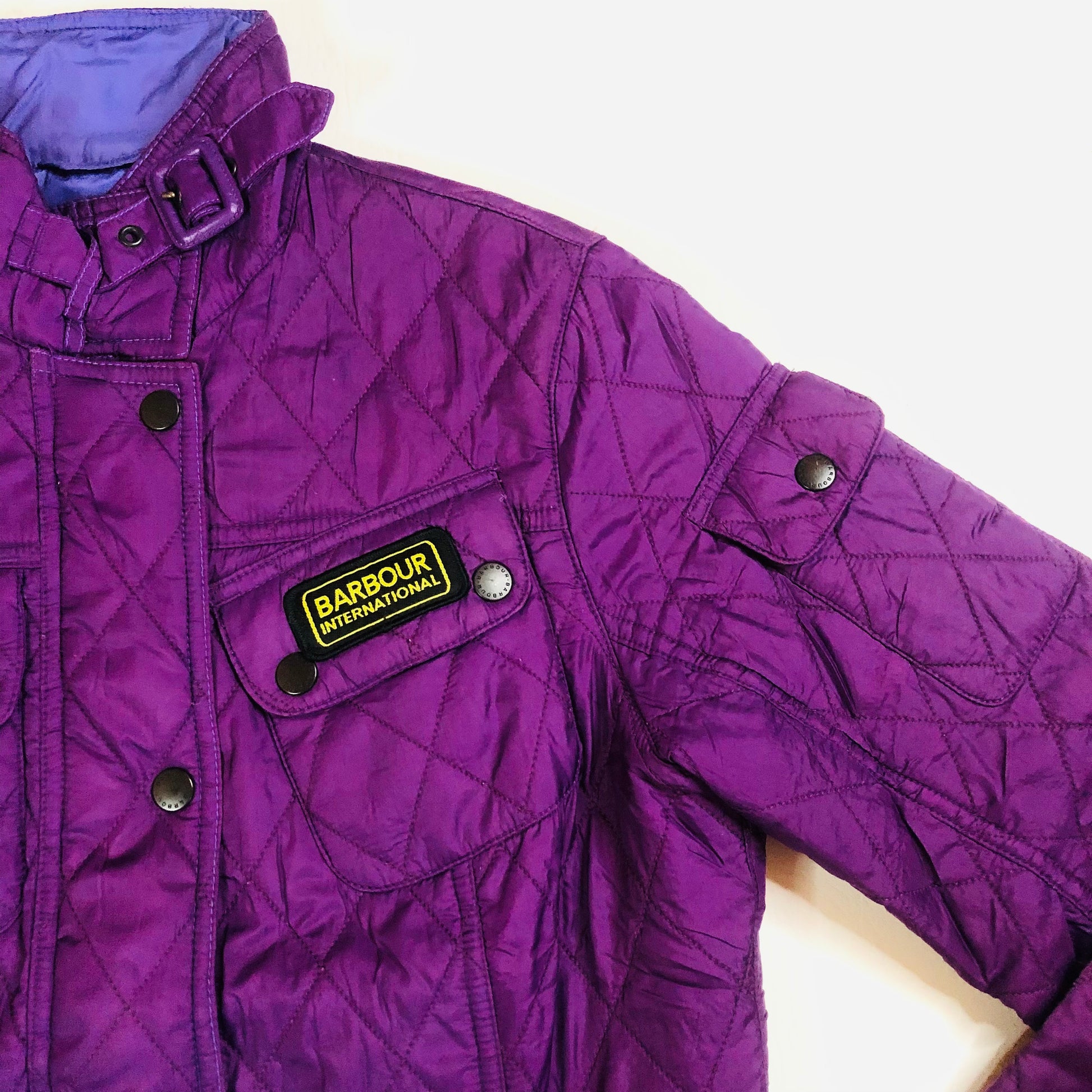 Make a statement with this stunning Barbour International quilted jacket in a bold purple hue. Featuring a flattering belted waist, diamond stitching, and signature biker-inspired details, this coat is both stylish and practical. With a high neck buckle fastening, multiple press-stud pockets, branded zip pulls, and a full lining, it's perfect for transitional seasons. Size UK 8. A standout piece for lovers of British heritage fashion, countryside chic, or classic utility style.