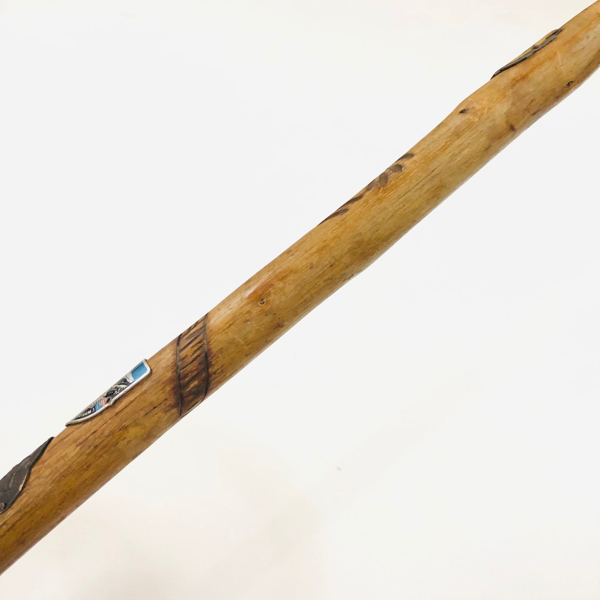Vintage antique wooden 33 inch Grindelwald walking stick carved & metal badges