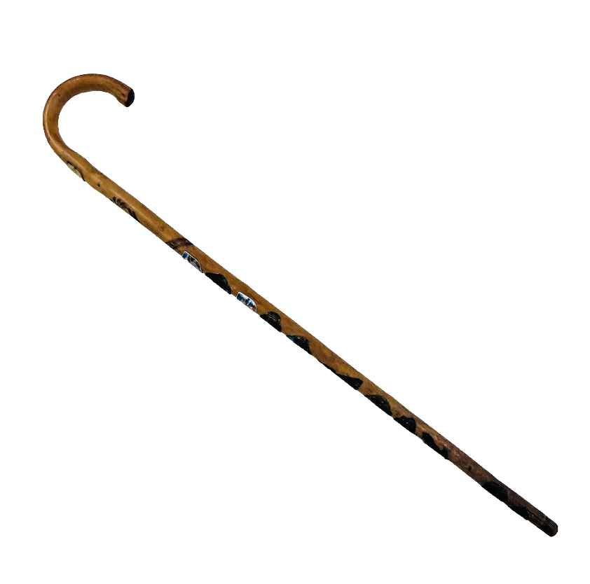 This vintage antique wooden walking stick is a unique piece that measures 33 inches in length. The stick features beautiful carving details on the top and small metal badges down its length, making it a great addition to any collection. It is carved 'Grindelwald at the top. It is an antique item that has been well preserved and is in excellent condition. This product is perfect for anyone looking for a vintage and original walking stick to add to their collection.